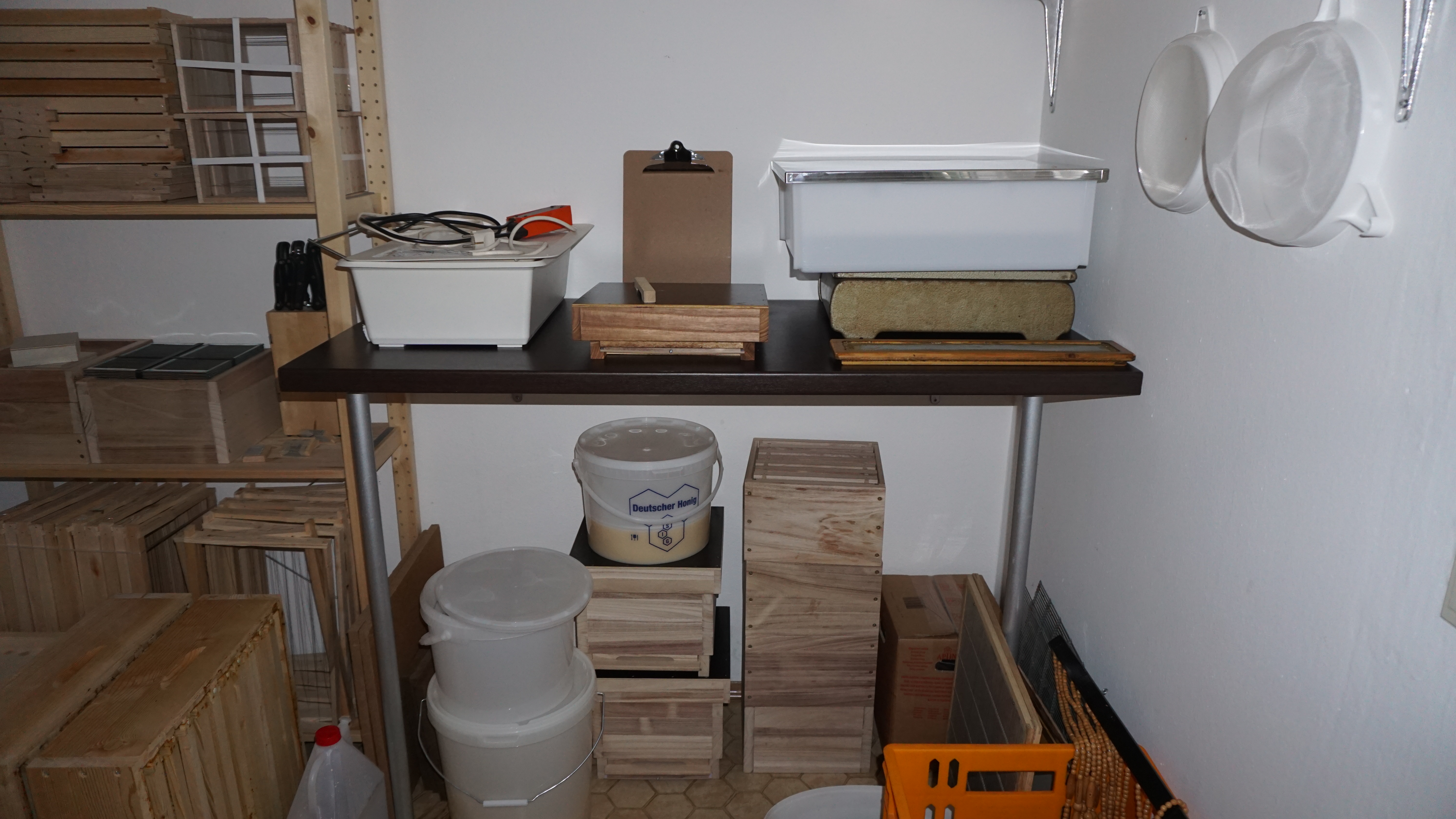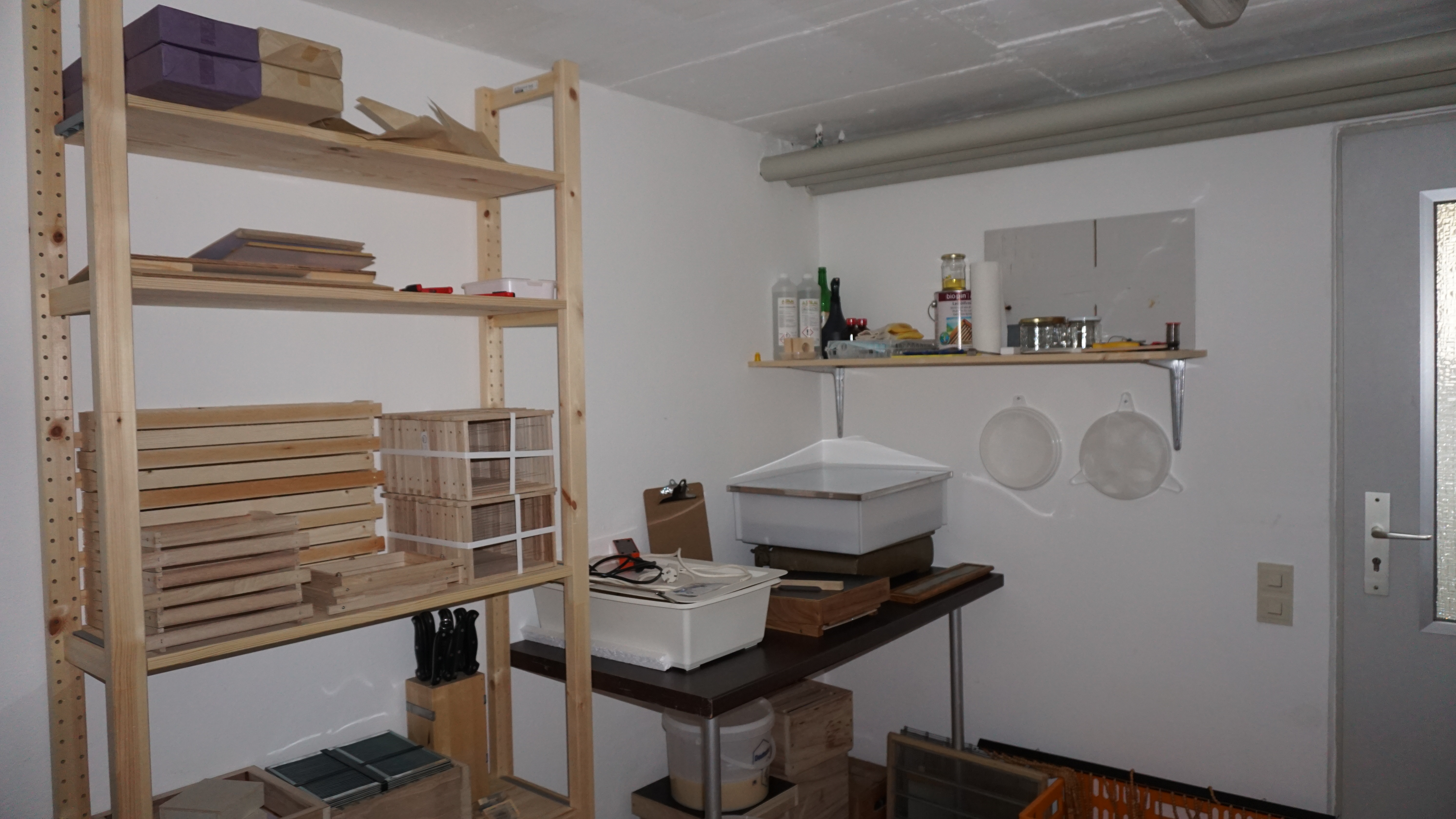 Jetzt habe ich sogar einen eigenen Ausgang und muss nicht erst durch das ganze Haus. Im Winter kann ich hier die notwendigen Instandhaltungsarbeiten durchführen, Wachs einschmelzen und natürlich Pläne für das nächste Bienenjahr schmieden 😉