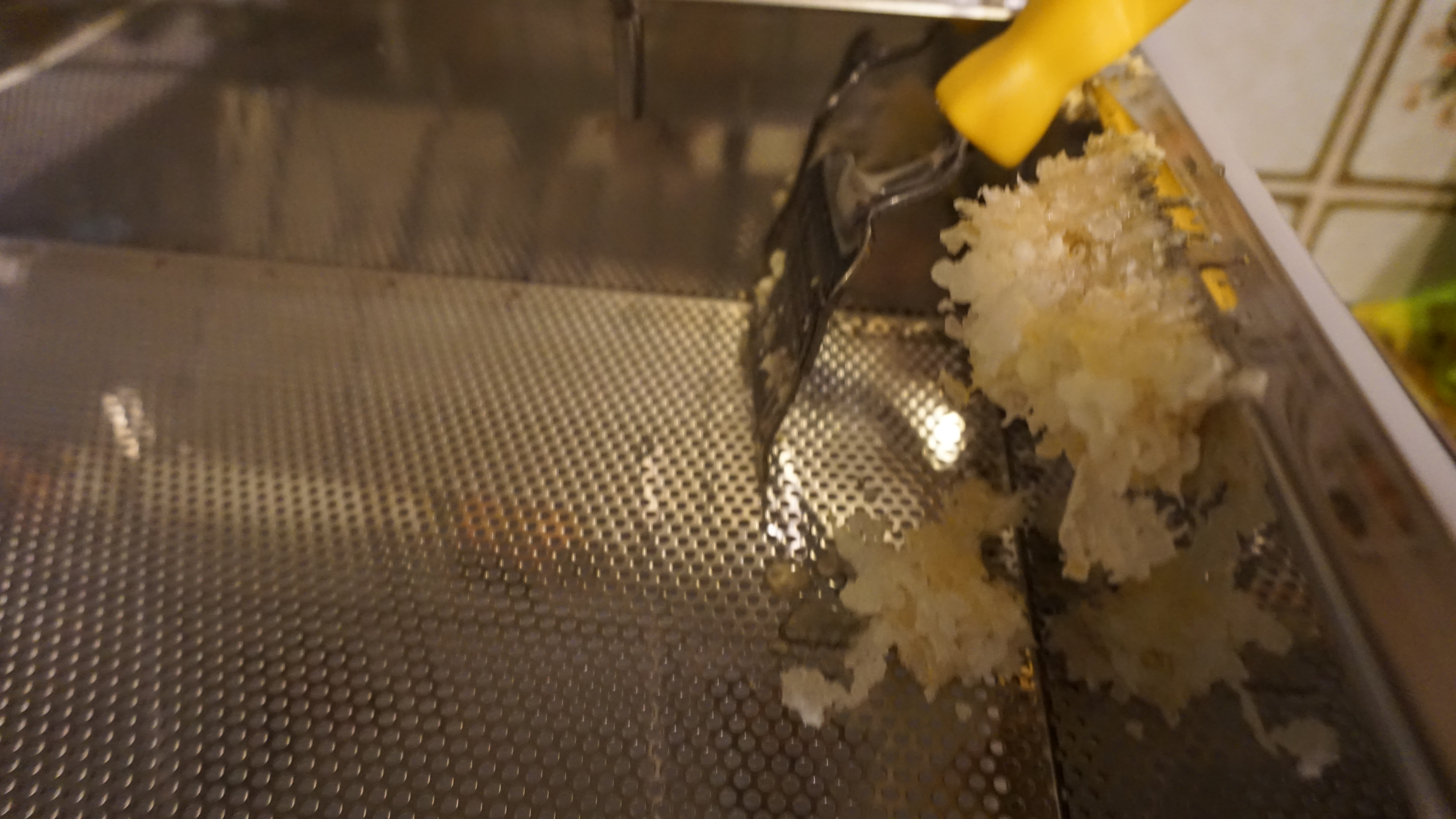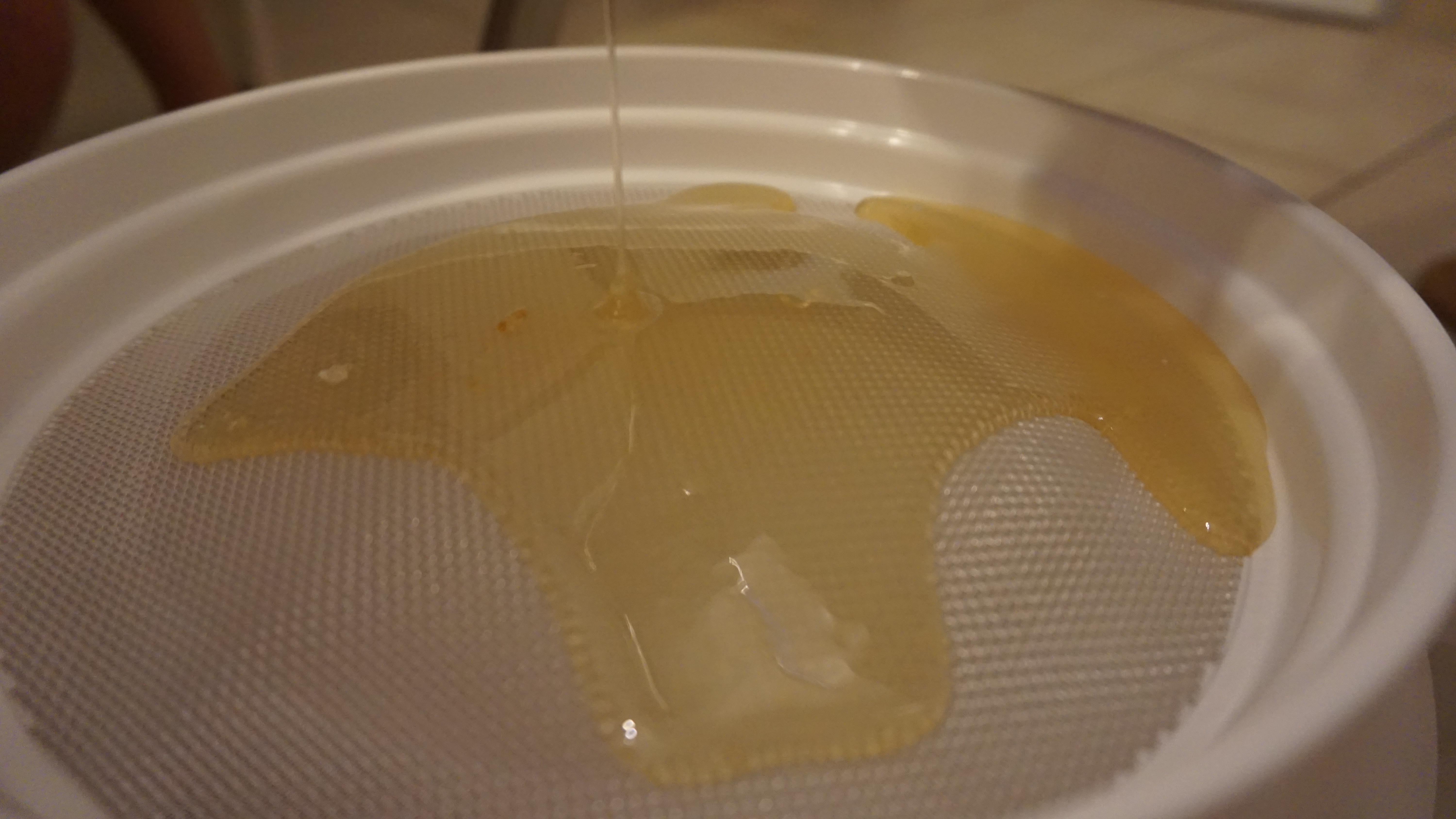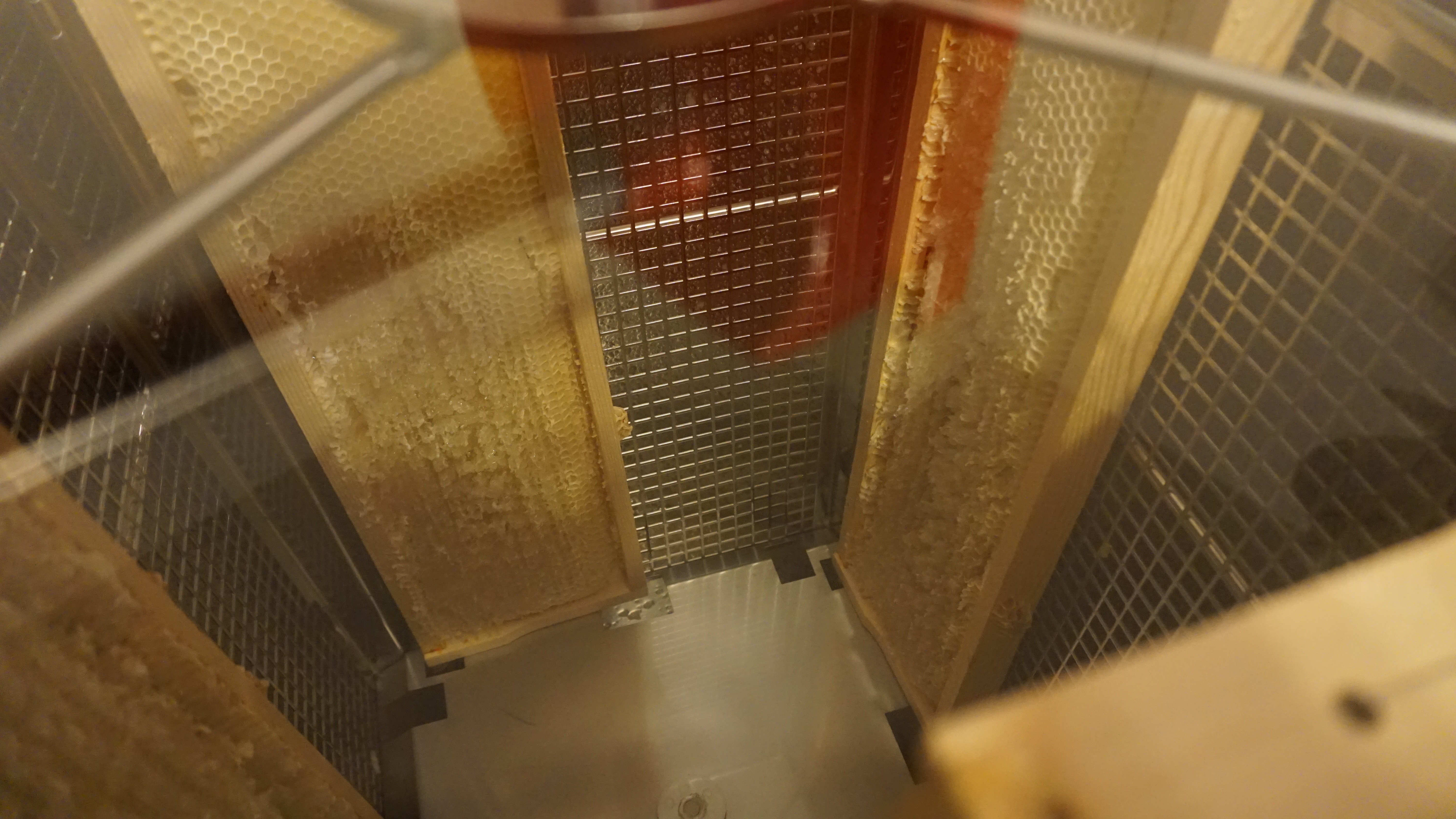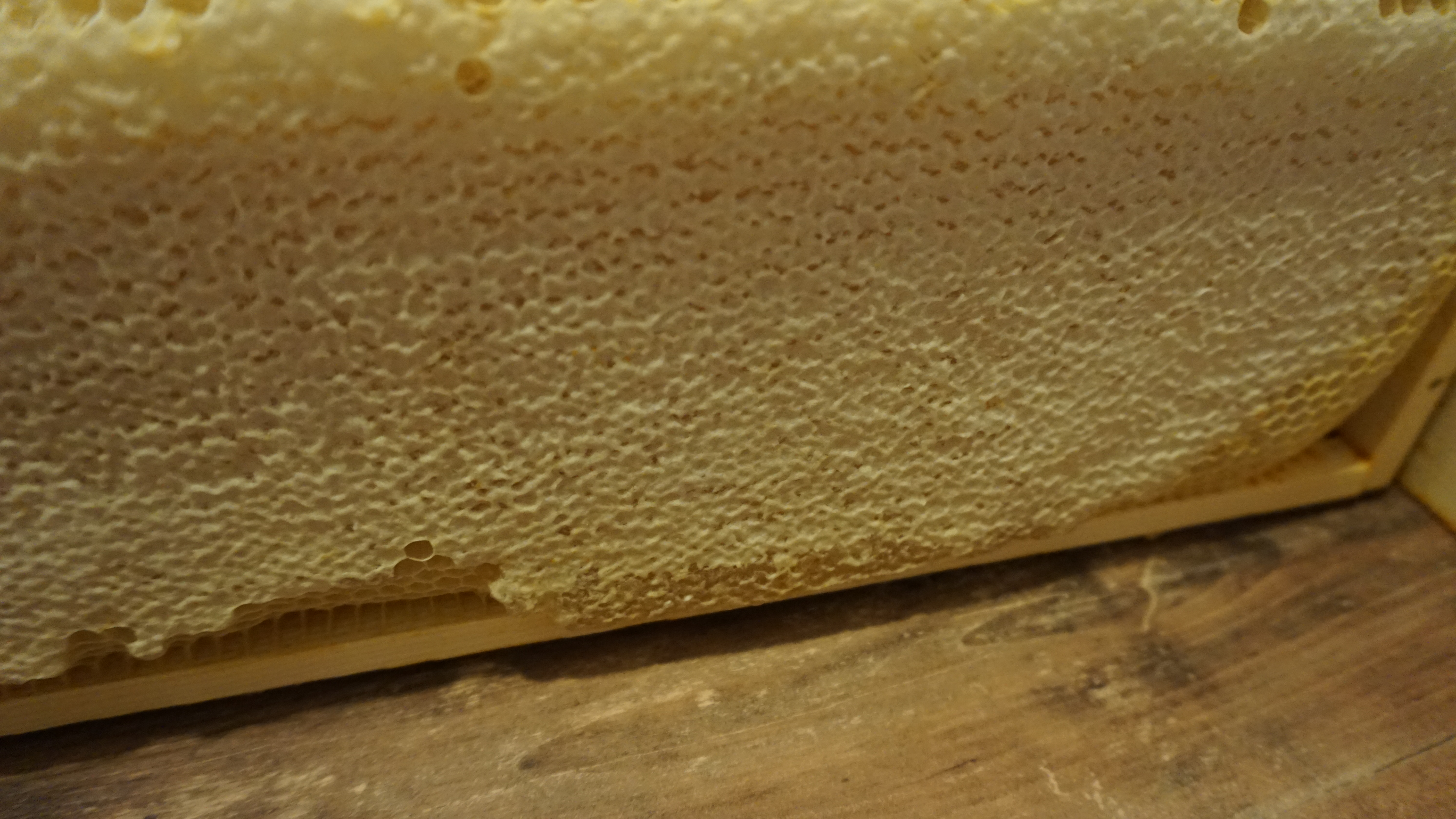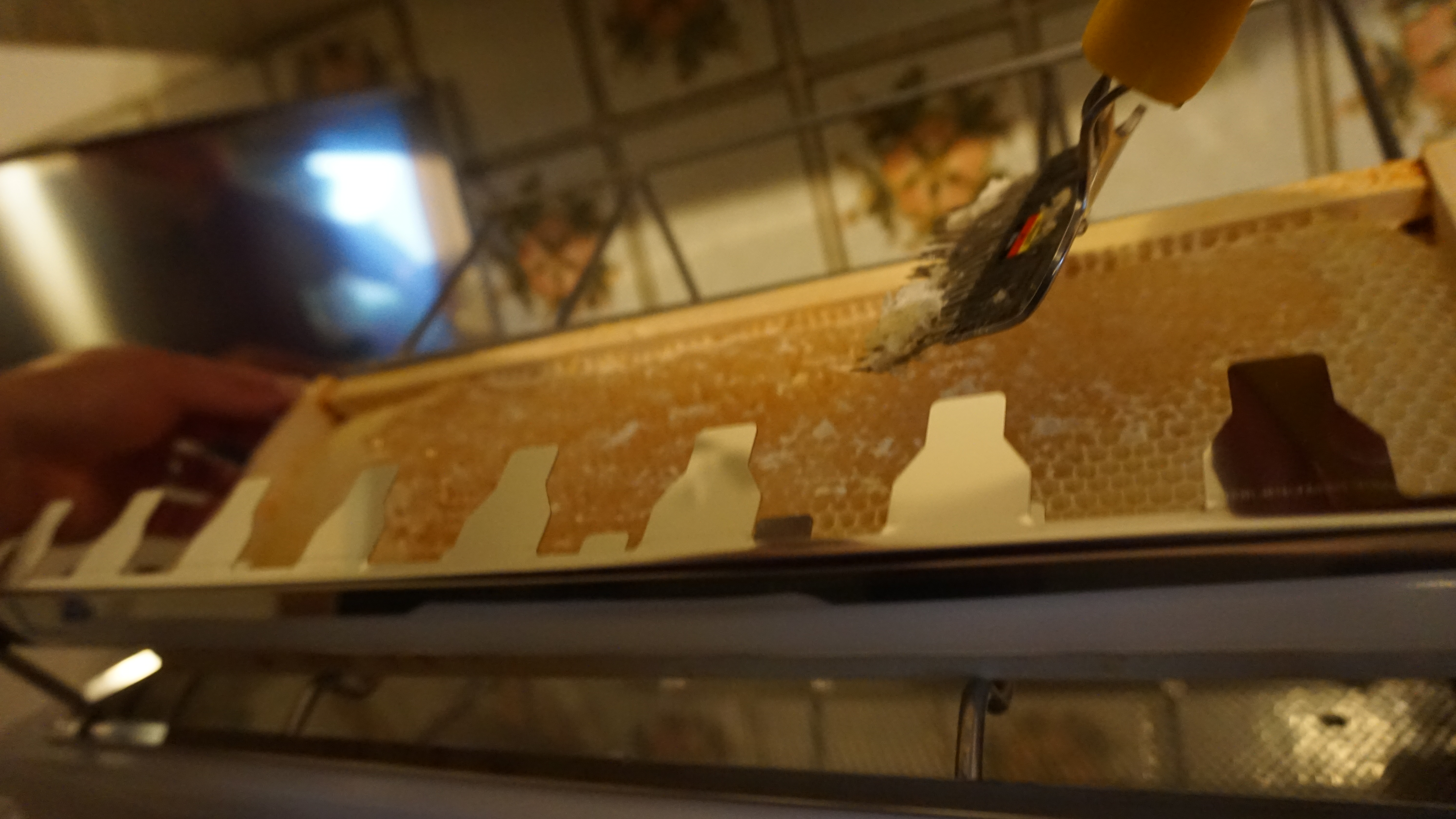 Tatsächlich war der meiste Honig bereits in der Wabe kristallisiert – ich konnte ca. 5,3 kg Honig ernten, der Rest steckt leider in den Waben fest.